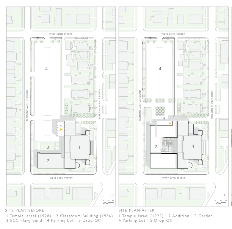 Organized in 1878, the congregation commissioned its first home — its existing classical revival temple — in 1928. A two-story education building was added in the 1950s, and in 1986, a car-centric portico over the main entrance. As the congregation continued to grow, Temple Israel soon found itself in need of additional space for formal and informal gatherings, as well as updated and accessible classrooms for its educational programming.
