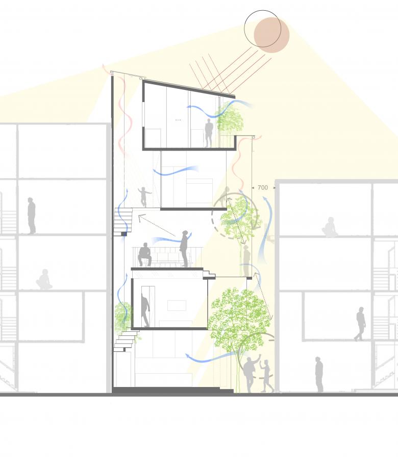 The city of Hanoi is facing a significant lack of greenery in public space. Greenery within the local subtropical climate serves as a functional element that can provide street shading and reduce the temperature in the city. It is also important to focus on the microclimate of the housing itself within the dense development. Greenery within the interiors and outdoor overhanging gardens improve the quality of life in the buildings. The arrangement and type of plants are chosen according to lighting conditions and spatial possibilities. Large planting pots are connected to automatic irrigation, which helps for the maintenance.