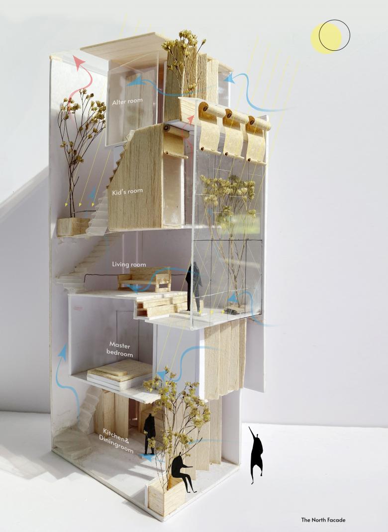 natural ventilation, planting greenery, and spatial interconnection of all floors so that members of the family can communicate between floors.