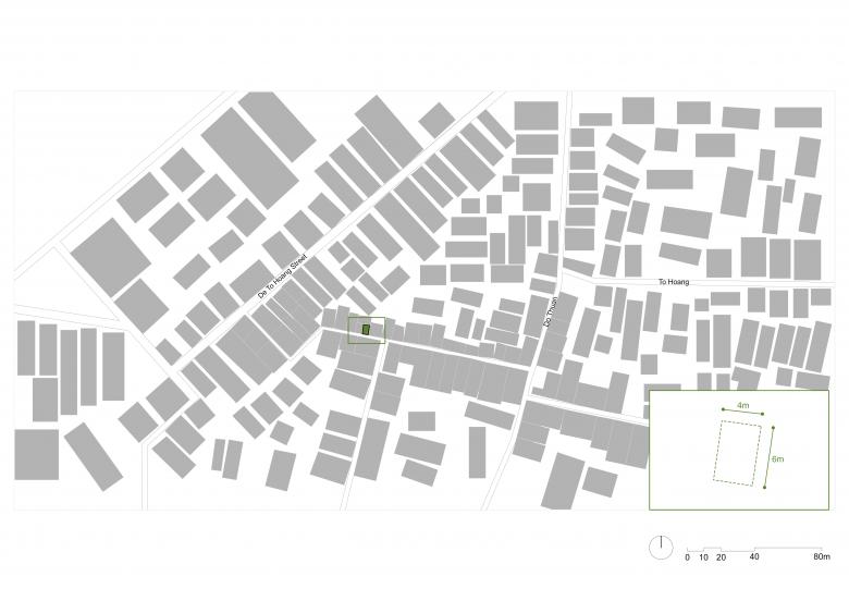 TH house is located on a narrow lot in a very dense area of the capital city of Hanoi. The plot of the house with a size of 4x6 meters has only a front facade facing a narrow 1.2-meter-wide alley. The local district is characterized by an informal arrangement of narrow houses on small plots connected by narrow streets.