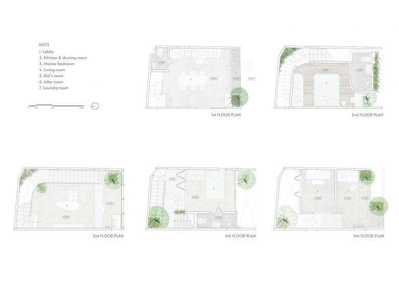 The living room — where all the family activities are concentrated — is arranged in the middle part of the house on the third floor. This main living area is located between the master bedroom on the second floor and the kids room on the fourth floor. The highest, fifth floor is designed as a praying room for a family altar and a laundry area with the possibility of an access to the outdoor terrace with a garden and a view of the surrounding intensive development.