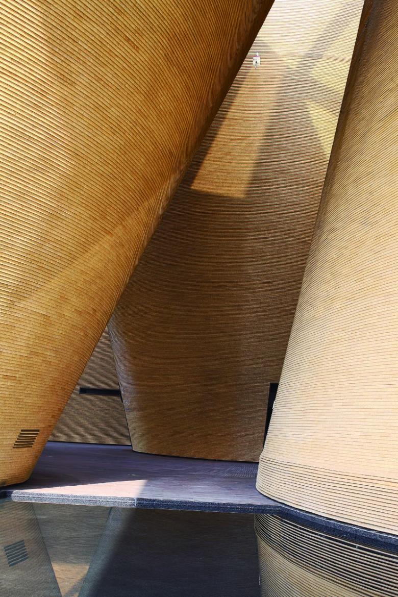 The Vanke Pavilion for Expo 2010 in Shanghai by Duoxiang Studio was awarded for its use of recycled materials, for handling environmental issues and details carefully, and for its innovative spatial organisation. The cone-shaped volumes are made of straw boards and are covered by a transparent membrane at the roof. The covered space between the seven cones was used as semi-public arena with natural ventilation underneath.