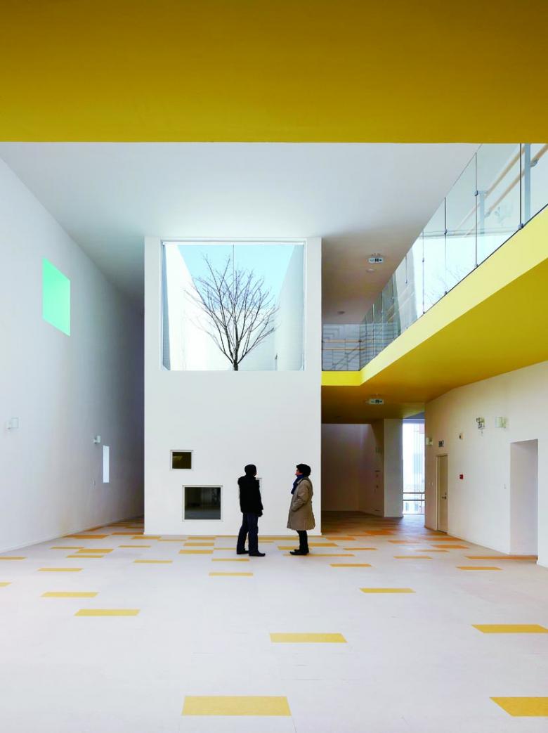 The awarded Kindergarten by Deshaus is located in Jiading near Shanghai. Its spatial organisation and dynamic space create an interesting circulation within the skilful organisation of the building mass. With a sophisticated color concept, windows of different sizes, a “ramp-building” for access to the second floor and some “courtyards in the air”, the solid building appears as perforated block in the suburban surroundings.