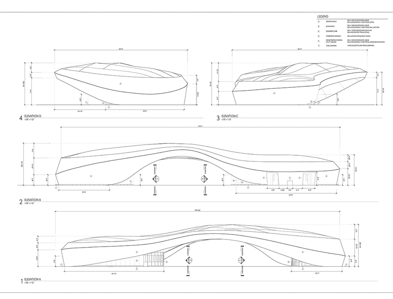 Programmatically, the project is comprised of two “Pods” from which each side of the superstructure contacts the ground, an open air canopy, and a larger landscape that connects to the river walk and new development. The “Pods” introduce a level of flexibility to the facility. The larger Pod is outfitted to accommodate a restaurant and the smaller Pod outfitted to accommodate a secondary-use of the same tenant, or can be operated by a completely different tenant. Regardless of tenancy, each Pod has ample outdoor seating that is protected from the sun beneath an 80-foot long canopy that soars 20-feet in the air.