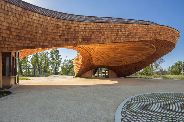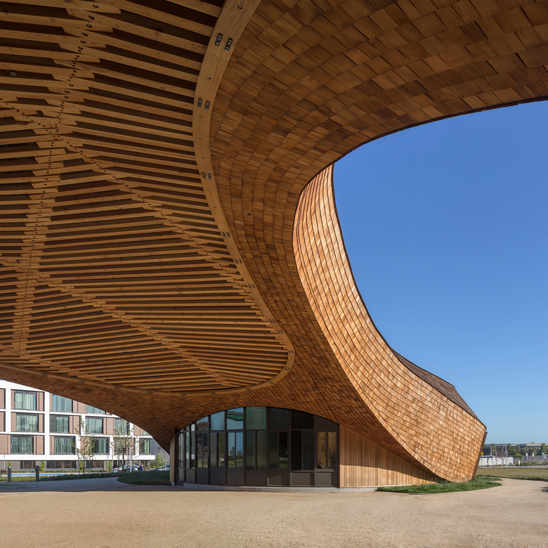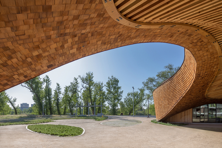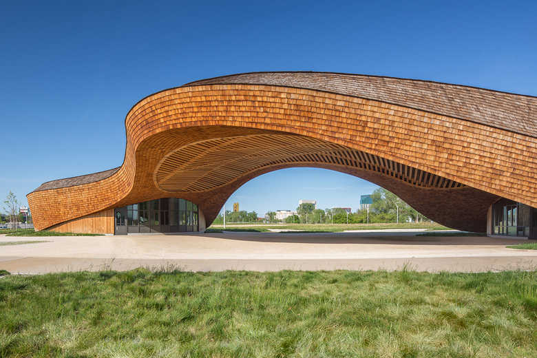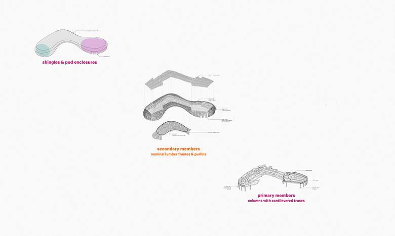 Structurally, the building is designed to seemingly defy gravity. As a double cantilever, the superstructure springs upward from two independent foundations, meeting at a dramatic apex that forms a sinuous canopy. The beams and trusses are constructed from glue-laminated wood. Intermittent steel reinforcements join the various trusses into beautifully expressed trestles visible from within the two enclosed “pods” and from the exposed underside of the canopy. The shell of the structure is achieved by using nominal wood members, laid side-by-side in a singular direction, to create straight line generated curves upon which the shingle roofing can be applied.
