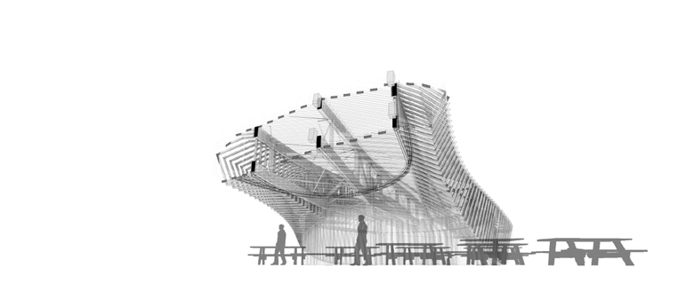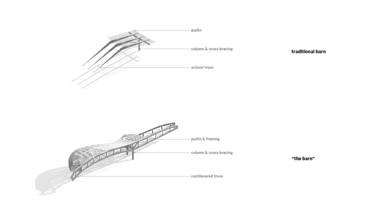Situated within the larger Northern California agricultural zone, the sculptural form of The Barn is inspired by a sprouting vegetable seed. This form is further informed by sun angles, whereby The Barn’s orientation on the site and the ultimate shape of its canopy maximizes the amount of shade created for the benefit of its users. The overall architectural concept is facilitated by a contemporary interpretation of traditional barn building components with the aid of parametric design.