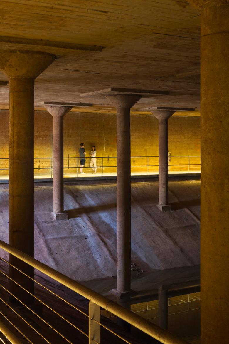Spanning 87,500 square feet — 1.5 football fields — The Cistern is a monumental piece of infrastructure transformed into a unique civic landmark. Its 221 slender columns with belled capitals and squared bases support massive 8-inch thickened slab roof system. The reservoir also boasts impressive acoustics, with a 17-second reverberation that elevates sound to that of a physical material.