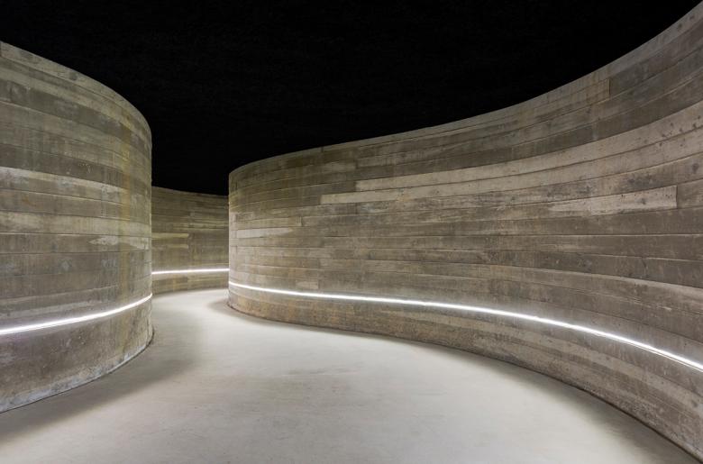 To preserve an element of surprise, a berm conceals The Cistern’s perimeter walls, so it blends into the landscape. A new entrance at grade initiates a gradual transition between the sunlight and activity of Buffalo Bayou Park and the saturated darkness of the interior. An 800-square-foot tunnel cuts a winding path through the berm that negotiates the change in grade, allows visitors’ eyes to adjust to low light levels and builds suspense by concealing  views of The Cistern’s interior. A ribbon of soft LED light illuminates the walkway and highlights the texture of board-formed concrete walls, which mimic the original construction method of The Cistern.