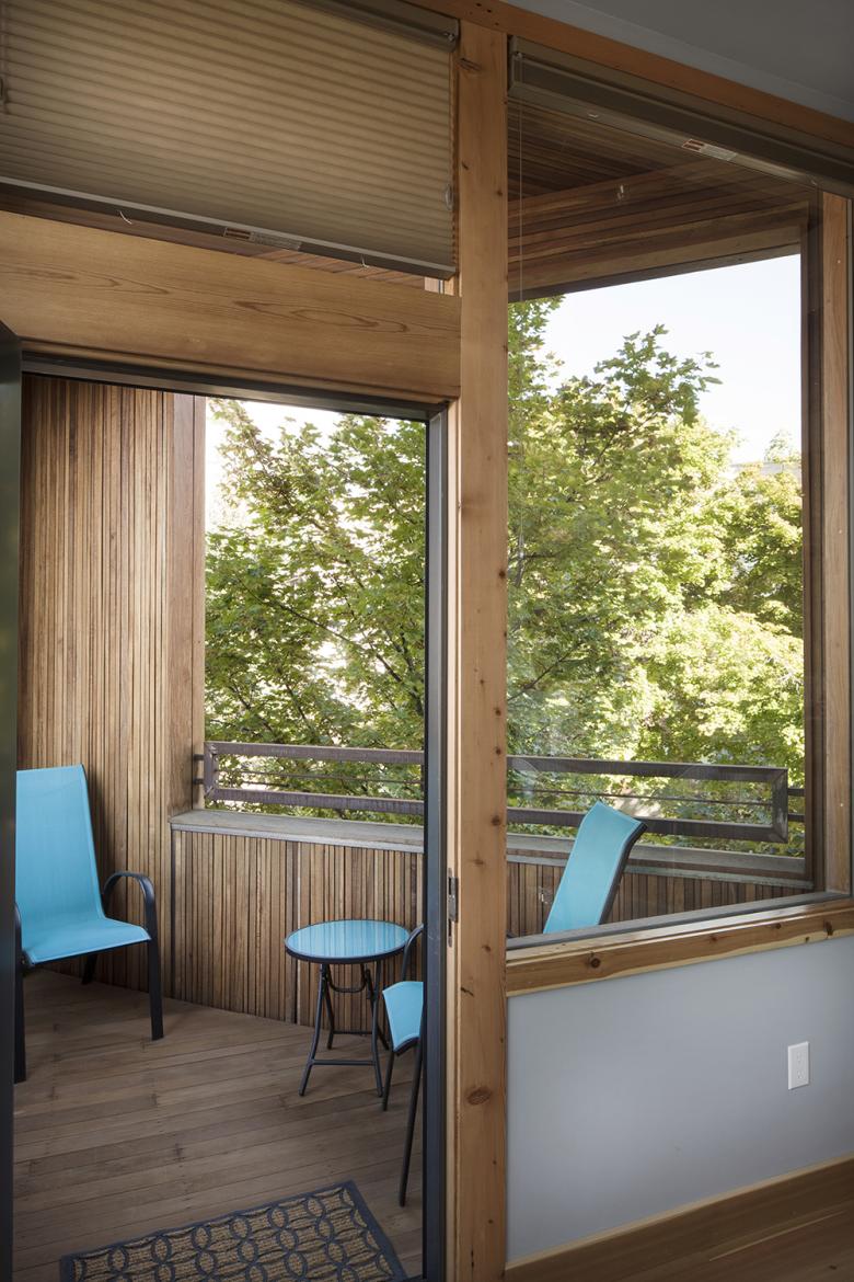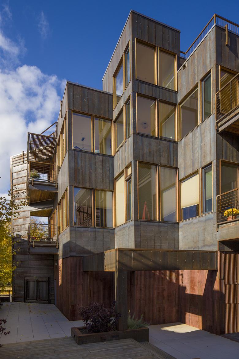 From the beginning The Corner has had the genes to relate to current contemporary trends, but as a ongoing process to create a better environment rather than to just fall in line with what is popular. The use of reclaimed pine, fir, African mahogany, redwood and ipe decking for most of the floors, cabinets, doors, millwork, decking, and ceilings were stockpiled by the owner years before the building came to be. Daylighting was and is always an important part of the projects done by our office, as is energy efficiency. The green roofs were not initially in the budget but their popularity made the added cost a non-factor and allowed the sale prices to reflect the cost.