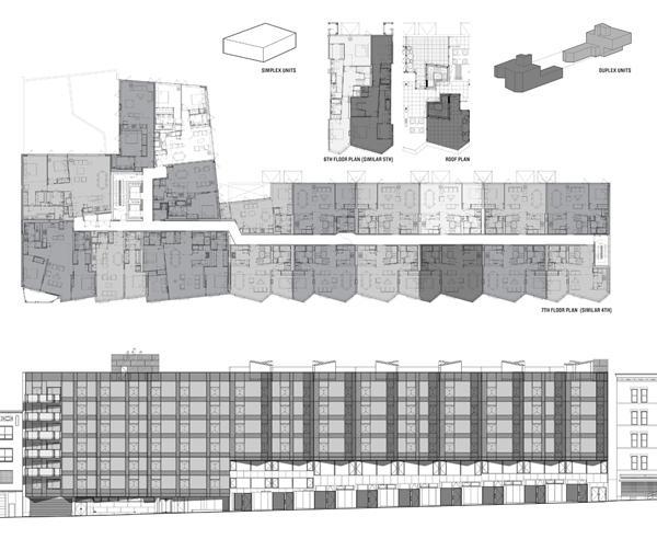 Slight changes in materials and interior dwelling unit configurations were made, but the conceptual basis of the project remained un-changed; that is, the presentation of a building typology unusual to New York City, a low rise high density residential building with diverse dwelling units, from studios to “skip-stop”, “thru-building” duplexes and street level Maisonettes, all served by a common below grade self parking garage.