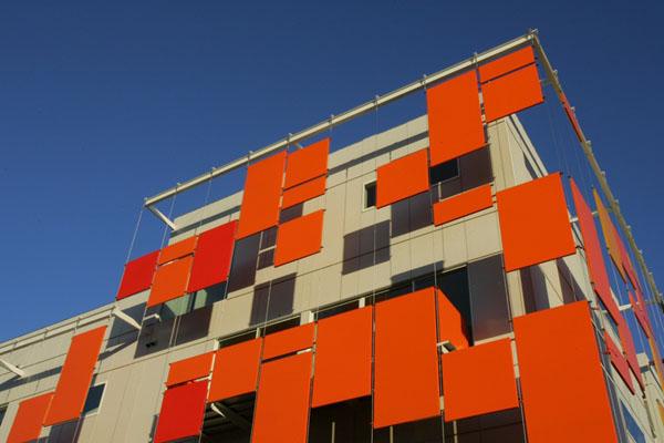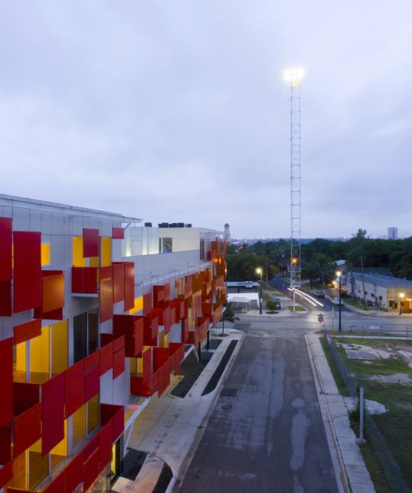 Austin, Texas-based Bercy Chen Studio enlivened the exteriors of this mixed-use development (retail, offices, residential condos) with colored panels inspired by Brazilian artist Helio Oticica. Like a sunburst across the corner façades, the design creates a strong presence in Austin’s East 11th Street Revitalization District. The architects answered some questions about the project.