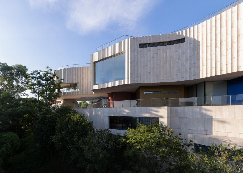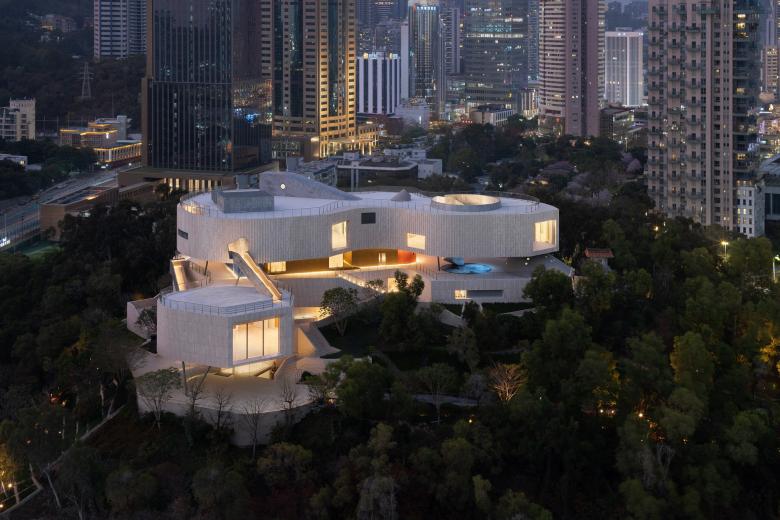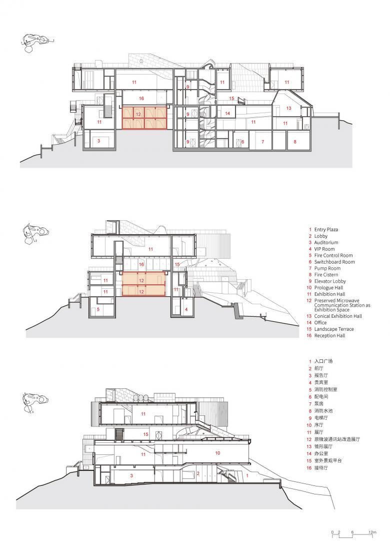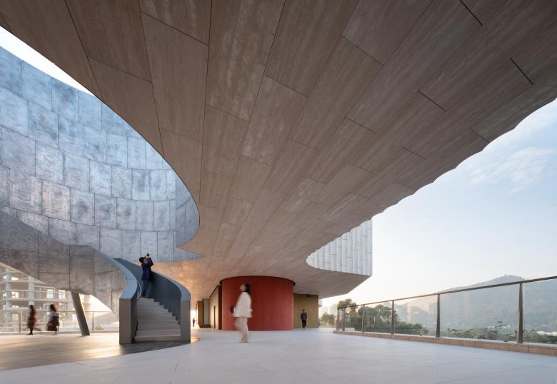 The building responds to the topography of its site. It is arranged over five levels and its spatial volumes similarly adapt to the sculptural profile of the hillside. The first and second levels house a permanent exhibition on the 150-year history of the China Merchants Group, that is spatially centred around the restored microwave relay station. The third floor is an outdoor viewing platform accessible from the public paths. From here, visitors have a view towards the Shekou district. The fourth floor houses an exhibition hall for contemporary art.