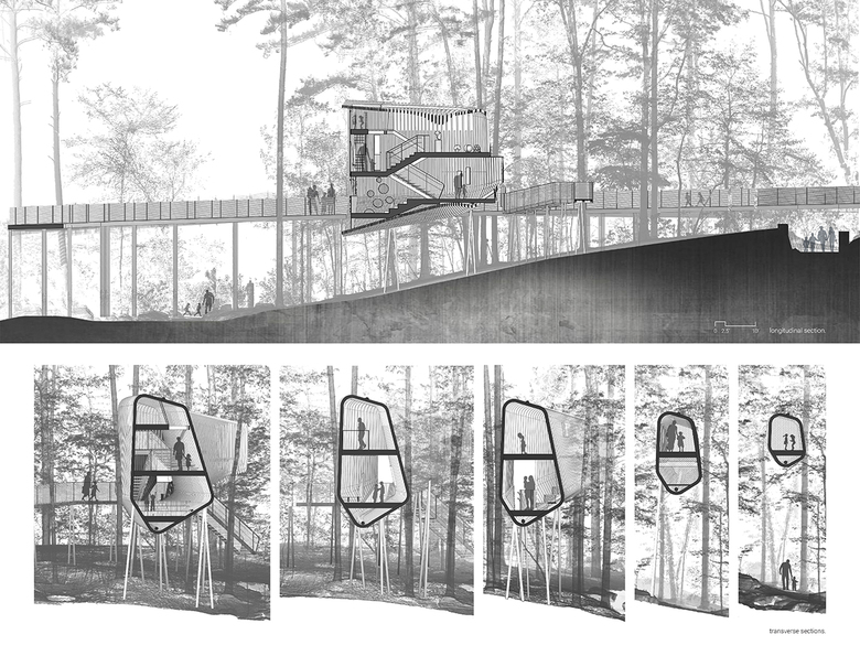 The underlying theme of dendrology, the study of trees and wooded plants, drives both the form and program of the structure. The 113 fins comprising the thermalized Arkansas-sourced Southern Yellow Pine screen creates a semi-transparent and an evocative form dynamically shrouding multiple levels of spaces for children and adults alike that refocus attention to the natural wonders of the forest canopy.