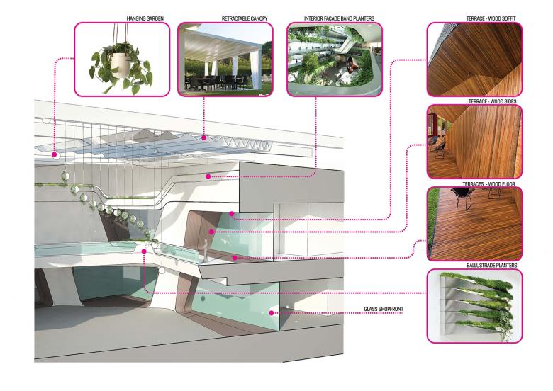 Given the unique position of the project facing the high traffic condition of Ploenchit Road and the BTS Skytrain and Skywalk, the facade and roof serve as a the graphic identity of the building while acting as a veil which reveals and conceals views. The primary driver of our formal organization and design concept in particular for the facade was the continuous flow of pedestrian and vehicular traffic along Ploenchit Road. The facade is articulated with continuous horizontal lines which change height to accommodate openings for restaurant and retail shop fronts as well as terracing areas.