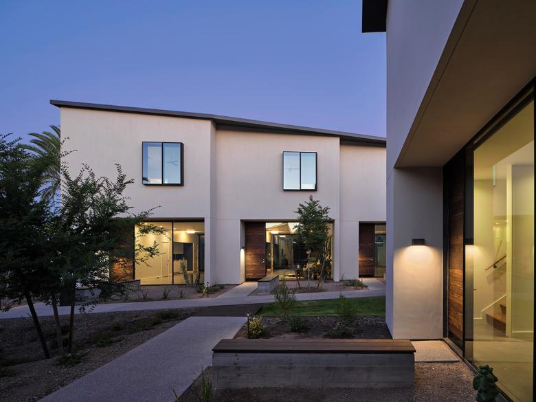 A speculative infill housing development in the Arcadia neighborhood of Phoenix, The Hollyhock's eleven modern, comfortable and sophisticated townhouses are organized around private gardens, lush walkways, and a community commons. Cost-conscious construction help make the one- and two-story living units economically attainable, and the highly sustainable design incorporates high-performing insulation and supports energy efficiency and low water use. Construction and finish materials including galvanized metal, sustainably harvested wood, and exposed concrete floors comprise a "long lifespan palette," representing reduced embedded energy and carbon associated with both construction and occupancy phases.
