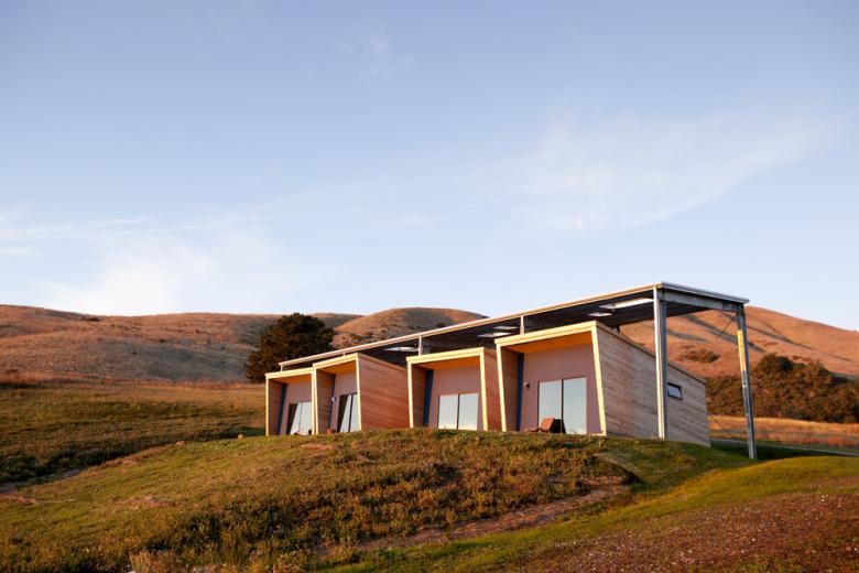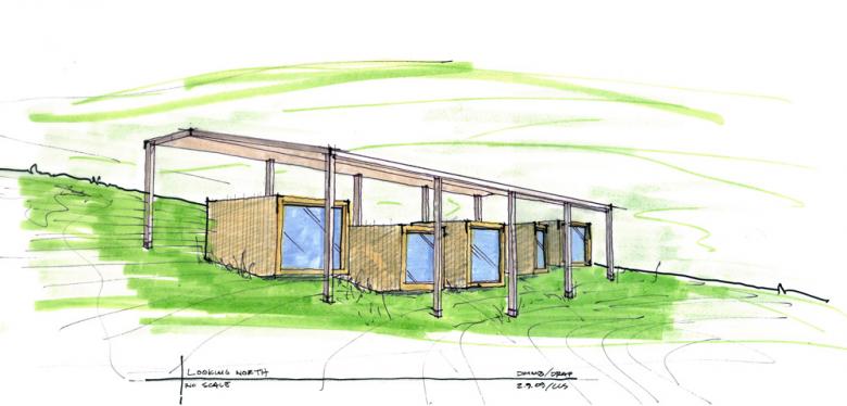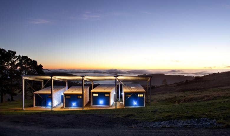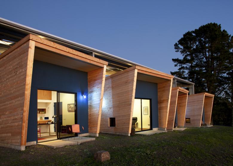 The four sleep/work cabins are designed with sustainable features, including a freestanding, pre-engineered steel roof assembly that carries solar panels.