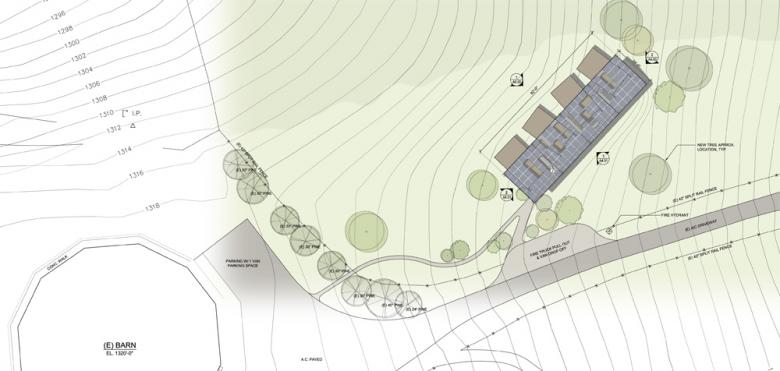 Then in schematic design, I explored a variety of building types and shapes, but decided it should be 4 small buildings that came together as a collective, and that is what the overall canopy roof does. I thought about what writers in residency would want and what would make them more creative than usual. From that I felt the best was to aim them at the Pacific Ocean to be inspired by the beauty of the place, yet with their own privacy. No other people, nor the other studios, can be seen from any of the studios, so an introverted experience is contrasted with an extroverted view. This was presented as an artistic endeavor to the clients and they really appreciated it – as they felt that anything created at the program should be of high artistic nature.
