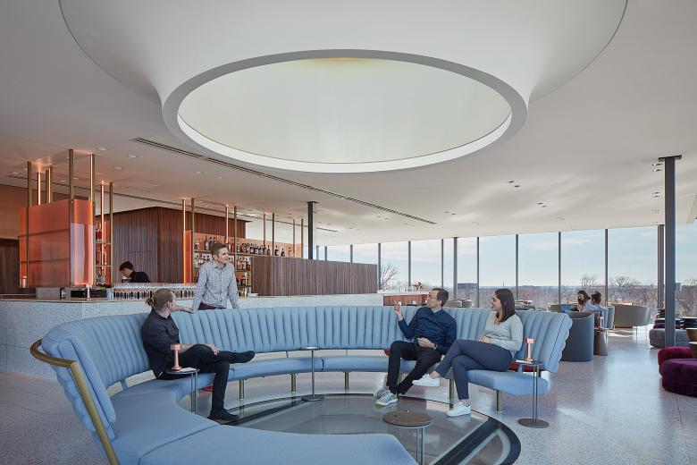 The 63,000-sf former Kraft Plant was transformed, along with a 10.5-acre site, into into a contemporary arts destination and opened its doors in February 2020. While the majority of the building is adaptively reused space, there are four contemporary additions that were made to the building, including a new main entry, a loading dock addition, a stair and elevator tower and a tower bar. Additions are built from glass, concrete and steel and are contemporary in nature, in juxtaposition with the existing masonry and precast structures. While the factory was focused inward and opaque, the new additions to the building use glass for views from inside and out. Inside, The Momentary purposefully overlaps social and culinary activities with art spaces to champion contemporary art’s role in everyday life. Visitors enjoy food and drink simultaneously with art exhibits in one of the primary visual art spaces.