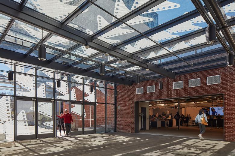 Rather than attempting to blur its newest additions into what existed before, contemporary interventions of glass and steel appear to float, superimposed on to the former factory. A frit pattern, inspired from ceremonial weaving designed by Addie Roanhorse, playfully changes in scale and transparency as it moves across the different glass elements to pay homage to the site’s history as Osage hunting land.