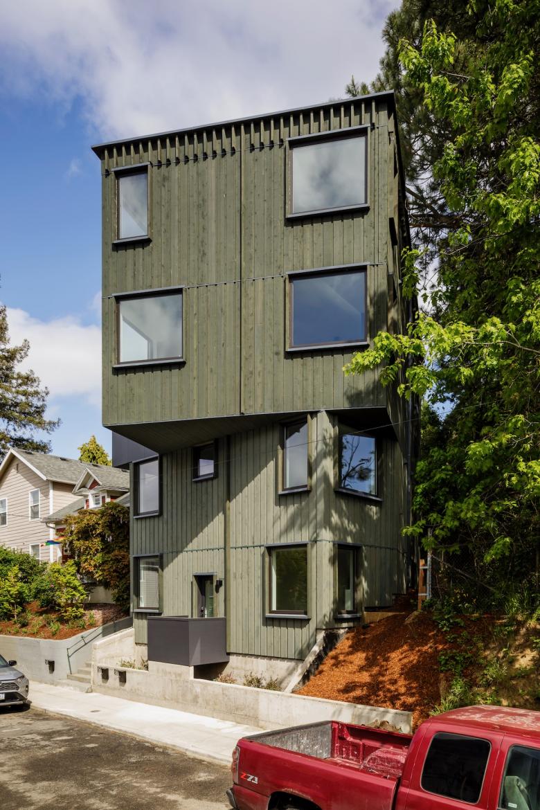 The Outpost is intended to demonstrate the viability of a progressive housing concept. The project provides an affordable option for people seeking community who don’t wish to rent an entire apartment or house by themselves. The co-living concept allows residents to decide for themselves what constitutes a “family.” The Outpost also threads the needle between existing definitions of group housing and household living within a residential structure, while preserving the ability to convert to a more conventional duplex arrangement if needed in the future. These aspirations for both intentional residential culture and for operational flexibility are expressed in its exterior form.