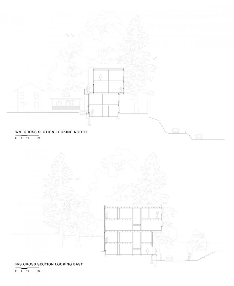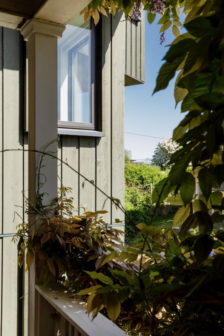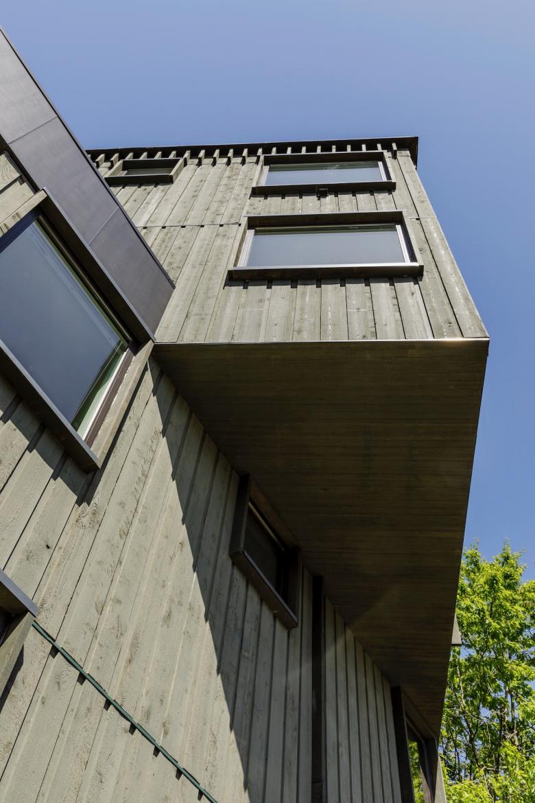 Within the duplex units, individual dwelling spaces consist of similarly sized bedrooms with a mix of shared and en suite bathrooms. The third floor is given over to an open-plan communal living area and kitchen that serves both the existing house and new duplex. The communal level marks the point at which the two uppermost floors bend away from the street to align with the angled sound-wall adjacent property line. This twist establishes a cantilevered massing that projects out over the sidewalk and re-orients the interior views to look over the freeway toward the Cascade mountain range.