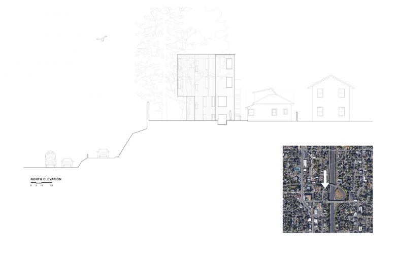 In an effort to find the best solution to minimize construction expense while maximizing the rentable area, the design underwent many early design iterations, including explorations of different types of cantilevers over the street and the existing house. Earlier versions also compared the pros and cons of conventional stick framing versus stacked, prefabricated units.