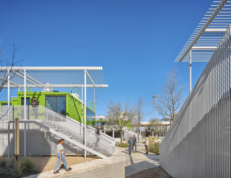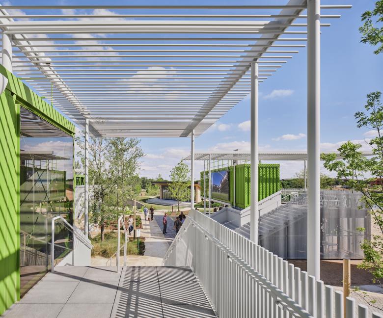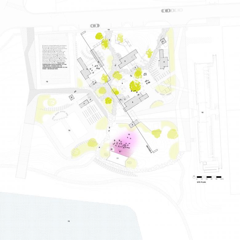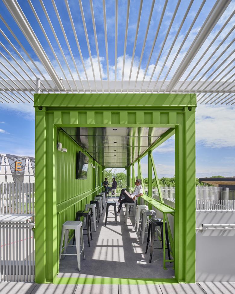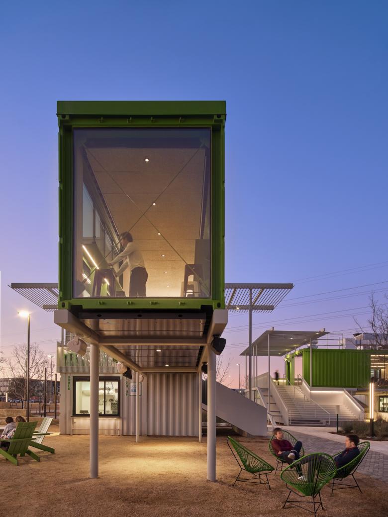 The Pitch design inspiration is stemmed from its context – the complex is situated at the intersection of large single family, multifamily communities, the development of creative and tech office spaces, and Austin's new professional soccer team's practice and youth club facilities. The client's requested exploration of the shipping container as a means of constructing a place was responded to by embedding container assemblies into the landscape and organizing the kitchens, bars, and office/event spaces around a central tree grove connected to the surrounding communities through landscaped paths and trails.