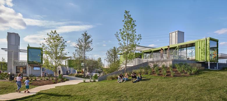 The manipulation of the landscape around the shipping containers was important to the realization of a comfortable food and beverage park. A focus on connecting the surrounding landscape to the site and making it a vital element that softened the assembly of container structures by embedding them into landscaped berms was a driving influence in the design of The Pitch.