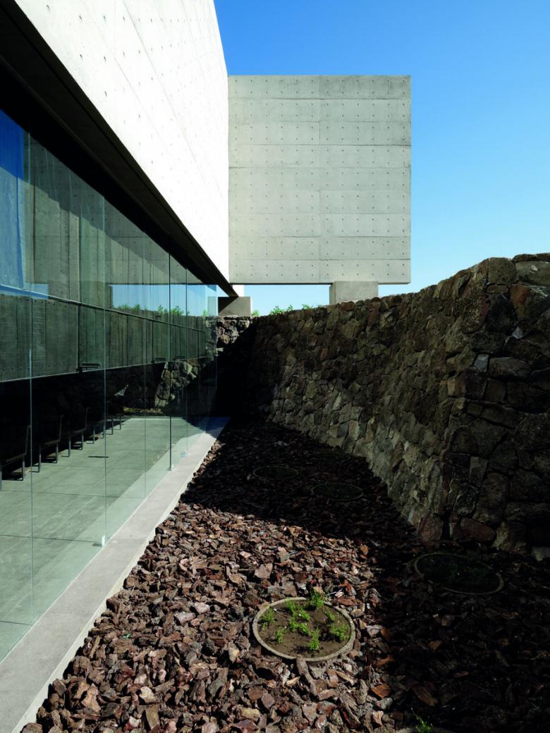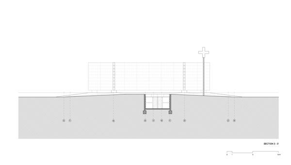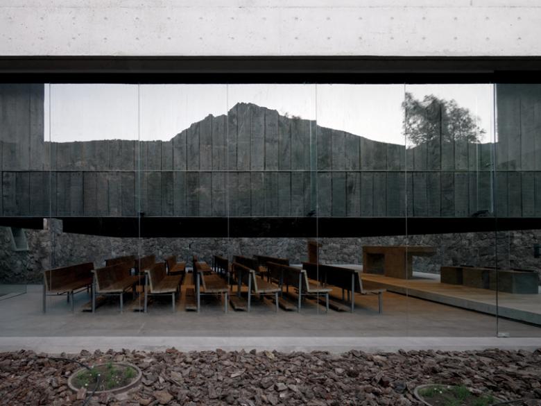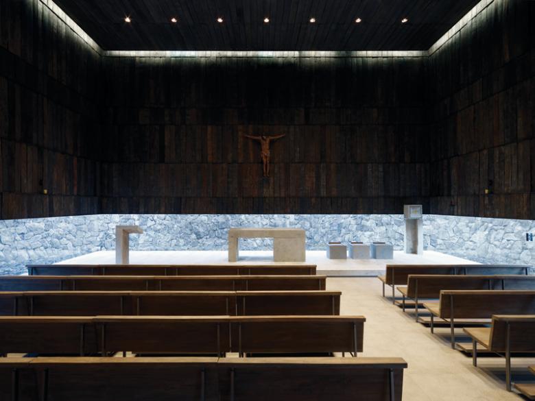 Concrete is the main construction material, and the building’s modest volume rises up from a crosspiece of four beams in the shape of a cross that is supported with the fewest possible structural elements. A patio was excavated beneath this volume, with a rustic stone wall roughly encompassing the chapel, compressing and expanding that space of light.