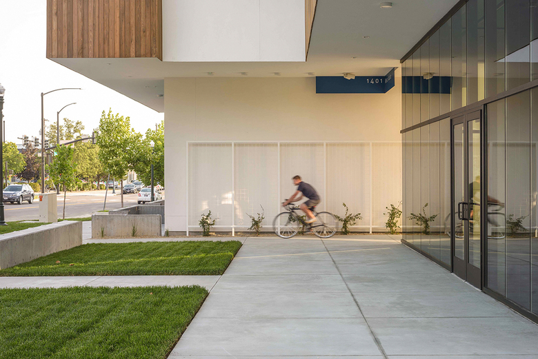 At the street corner, the Watercooler steps back to create a semi-public park. This privately owned, publicly accessible space is a contribution to the City of Boise’s 2001 master plan transforming 14th into a pedestrian street. A covered breezeway provides a pedestrian connection between the corner park and parking area.