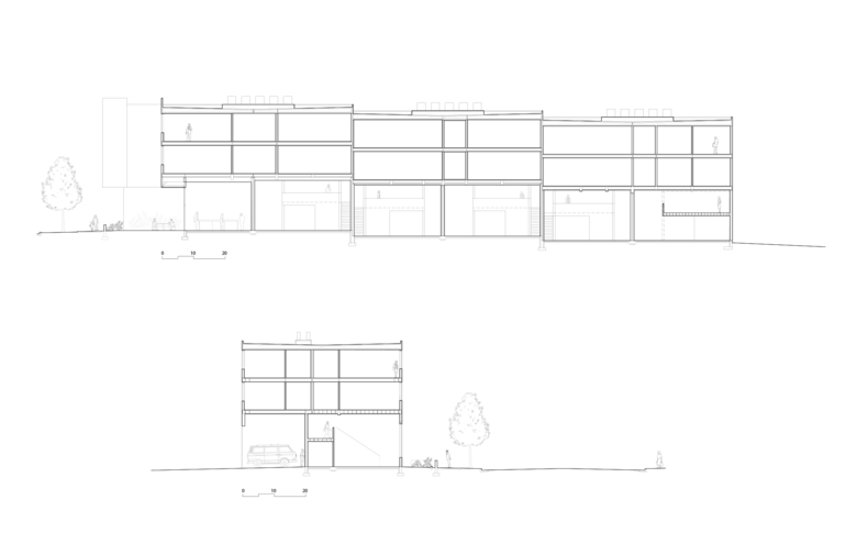 To address the street edge, the Watercooler is organized into four nearly identical blocks, repeating and shifting in plan to form offsets at regular intervals along the sidewalk. Cantilevered portions of the upper floors extend to create an arcade-like zone along the building facade for shade and weather protection at the unit entrances.