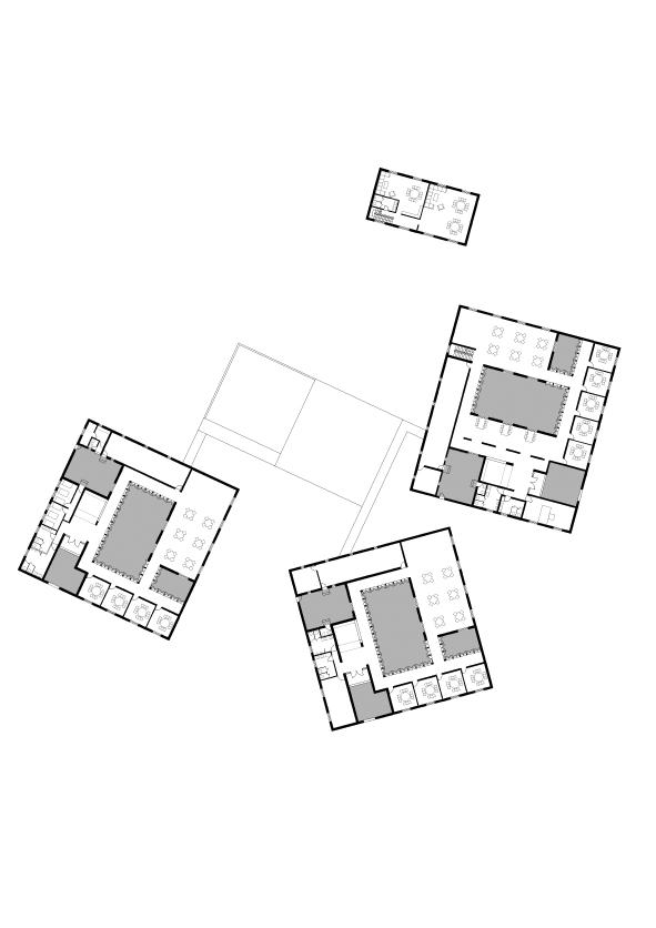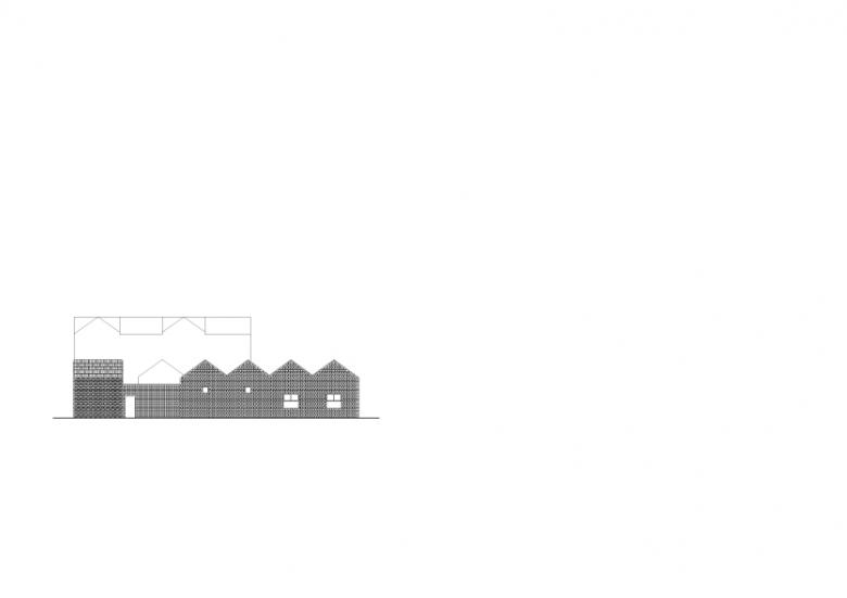 Zhang Lei bonds several pitched roof units into an additive structure and uses this method for each of the three complexes. Thereby the square or rectangular form is taken for the interior open and closed spaces, in accordance with traditional space pattern. The series of pitched roofs on each side of the courts give them the appearance of a small village and breaks the complex visually into clusters that refer to local typology. One of the three clusters has a block composed of two storey elements, each with the pitched roof turned around 45º. The visual appearance of this block with its turned roof’s, adds a surreal flavour to the traditional forms and refers to a cultural discourse about architecture far beyond the local cultural context.