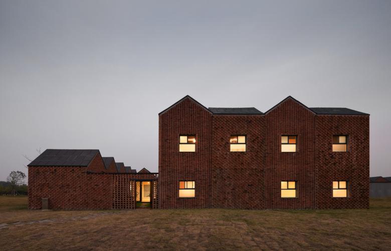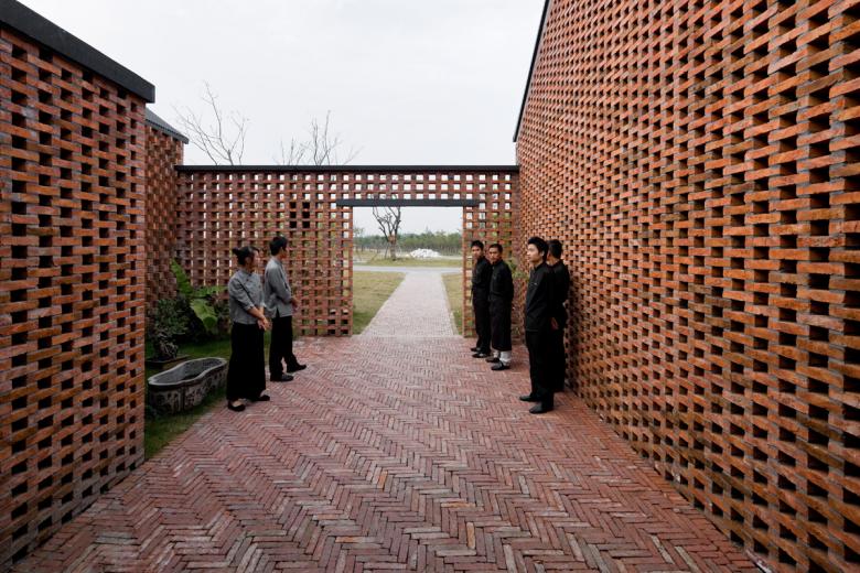 On one side of the centre there is a business-park with new office buildings whereas on the other side an old village of local farmers is located. The new community centre is aimed to serve for both, the people of the village as well as those working in the new business-park. Each of the three buildings is composed around several courtyards with bamboo, stone and water in the typology of the nearby villages. They are embedded in a bigger open public park with trees and bamboo and a nearby stream. The single complex is composed of many small, one-storey units with pitched roof. The reference to the local village architecture is obvious. Besides the formal reference of the single architectonic element, the red bricks of the exterior walls and the use of open walkways with traditional wooden lattice-works in the pattern of crushed ice, make the renewal of historic elements in contemporary architecture a success.