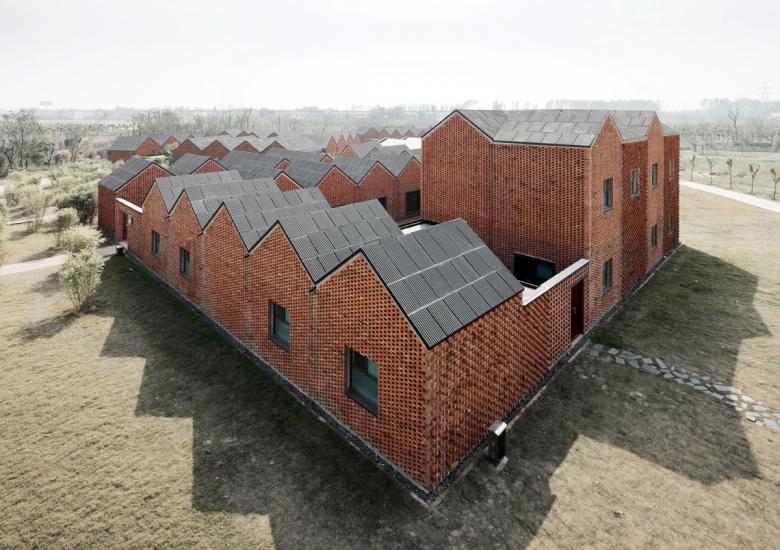 Another stunning topic is the use of the red bricks for the walls. They are made of local material and used for both, the construction as well as the skin of the buildings. Two different kinds of patterns where used to create an interwoven texture. For two sides of the buildings, every second brick is turned around and sticks out of the wall. Such a pattern creates an interesting play of shadow on the walls with only few regular openings. The second type is created by using the surface as a blind brick lattice, creating a negative pattern, that has an interesting texture in the light of the sun. In other words we could say that it is a modern interpretation of the old Chinese balancing system of yin and yang, positive and negative, masculine and feminine.