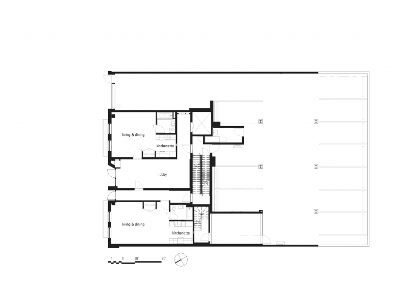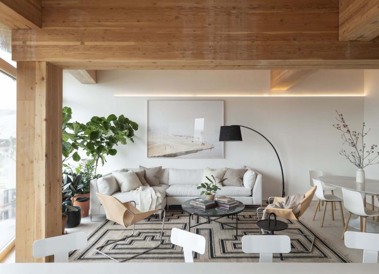 Natural light floods in through expansive glass windows, illuminating the beauty of 11-foot wood-beamed ceilings. Scandinavian kitchens are airy and bright, with patterns and materials artfully designed for the building. Fresh air is continually replenished, and half of the units enjoy private outdoor space. There are 14 homes: 2 studios, 2 one-bedrooms, 3 two-bedrooms, and 7 three-bedrooms.