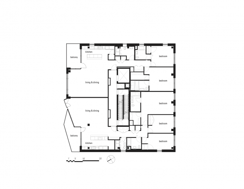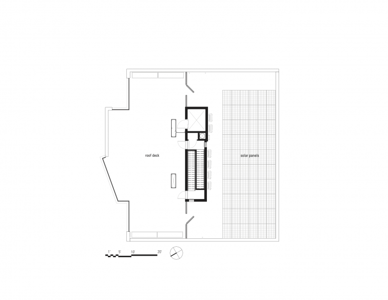 In New York City, the form of the building is to a large extent determined by the allowable zoning envelope and site conditions. Within these constraints, the building takes advantages of views to the west of Manhattan in the distance (a view facilitated by the downward topographical slope) with angled large windows and terraces on the upper floors. On the lower floors, the punched-opening window pattern conforms to the module of other houses on the street. This module, in conjunction with the brick facade, helps the building to engage the existing built fabric of the block even though it is larger and ultimately quite different from these older houses.