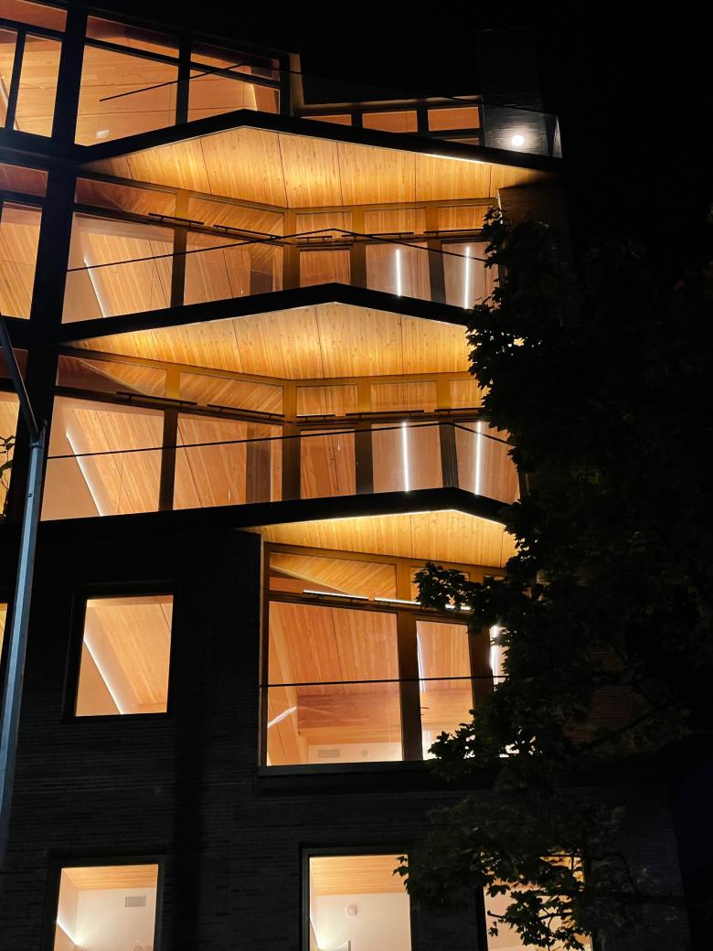 The building structure, including columns, beams, and floorplates, is made from glue-laminated timber. This building material has been beloved for decades, but recent computer controlled fabrication processes have made large-scale timber buildings feasible.