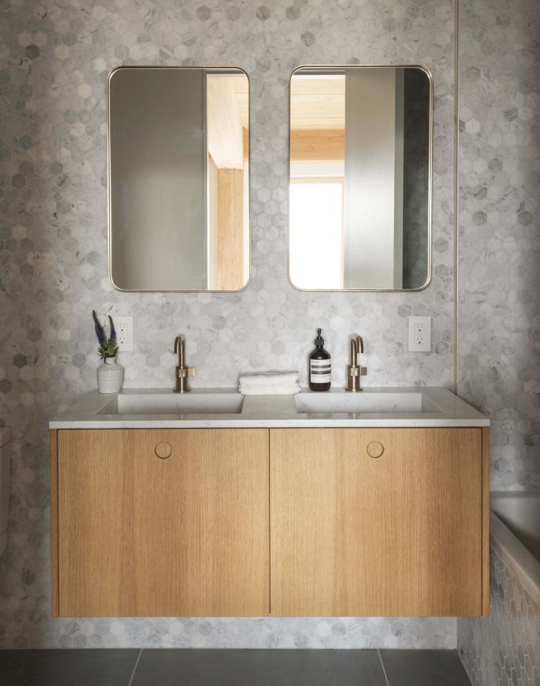 - The kitchen cabinets are light wood boards wrapped with aluminum — minimal but tactile.