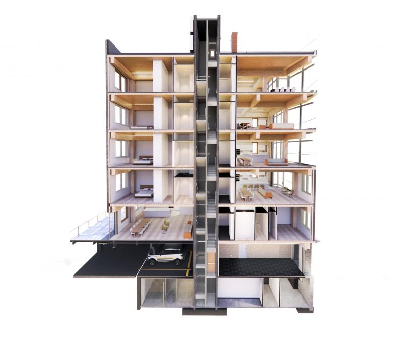 The six-story, fourteen-unit building comprises glue-laminated timber columns, beams, and floorplates. (Technically it’s a hybrid structure: the core and lot-line walls are concrete block, per fire department requirements.) Old-school heavy timber was hewn from old-growth hardwood trees. Today’s mass timber, by contrast, is fabricated from standard dimensional lumber, such as 2x8s, milled from fast-growing pine and fir trees. (You will hear mention of mass timber’s variants: CLT, GLT, DLT, and NLT. There are important differences between these, mainly in how the boards are fastened together, but they are all mass timber.)