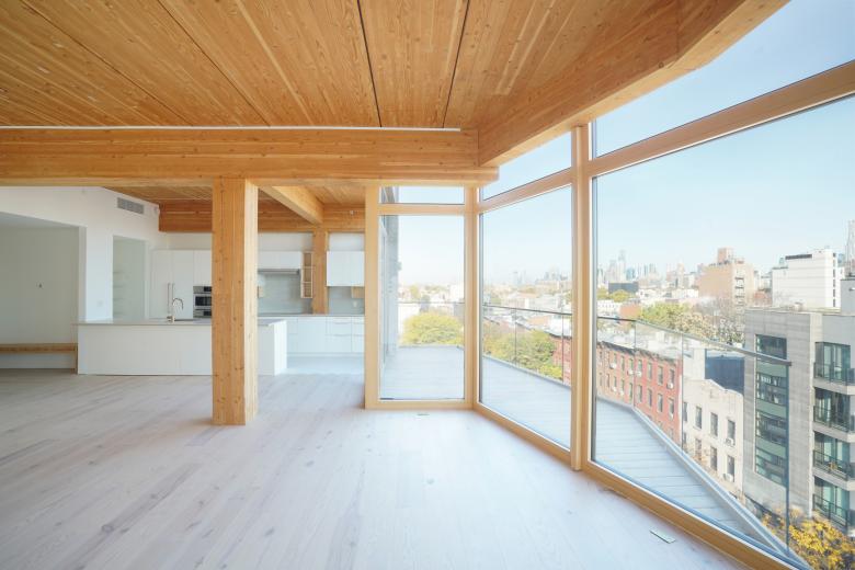 The exposed wood structure is the obvious distinction that makes the building unusual, particularly in New York. The feeling inside each home is quite different from any other: it feels warm and deep, in contrast to the feeling of being in a wallboard box that is familiar from most new apartment buildings.
