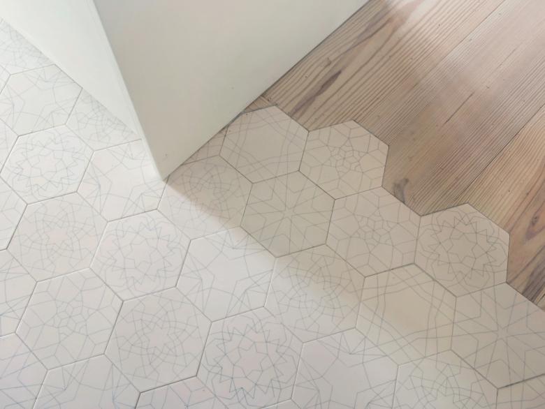 - MESH designed the hexagonal tile series: each set has various patterns on the tiles, so when installed randomly on the floor they create endless patterns. This effect supports the concept of evoking life in the building’s construction.