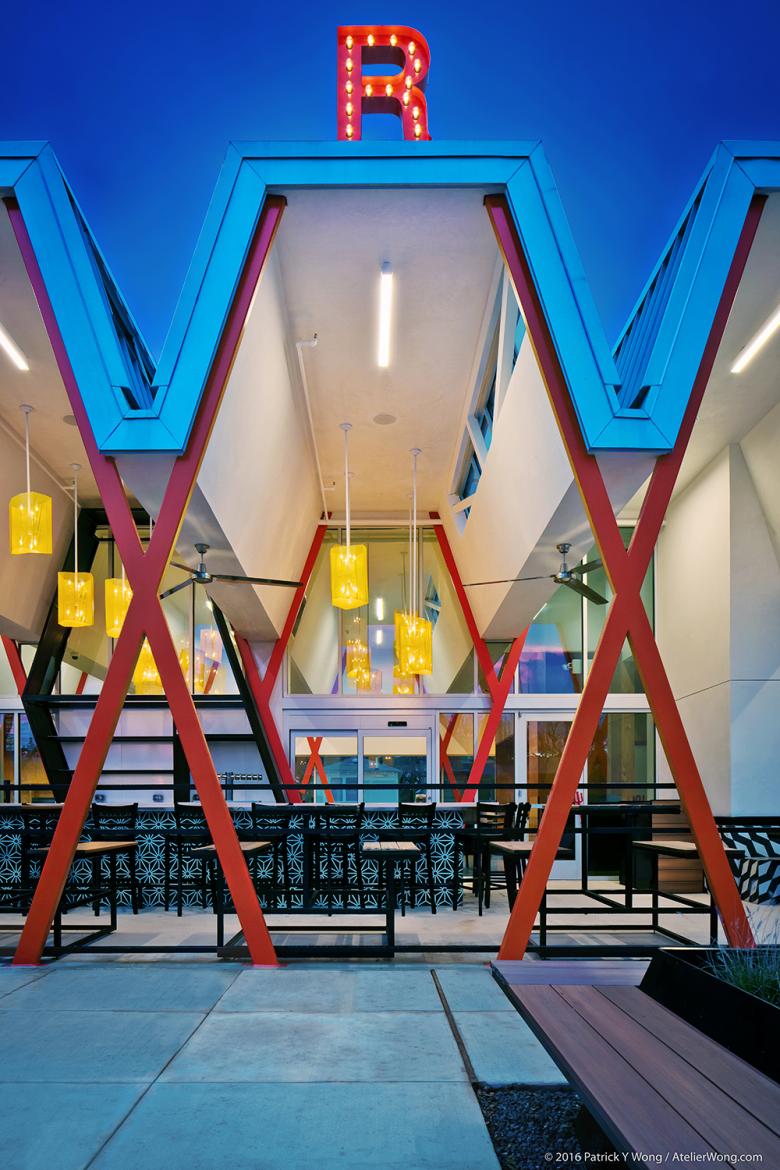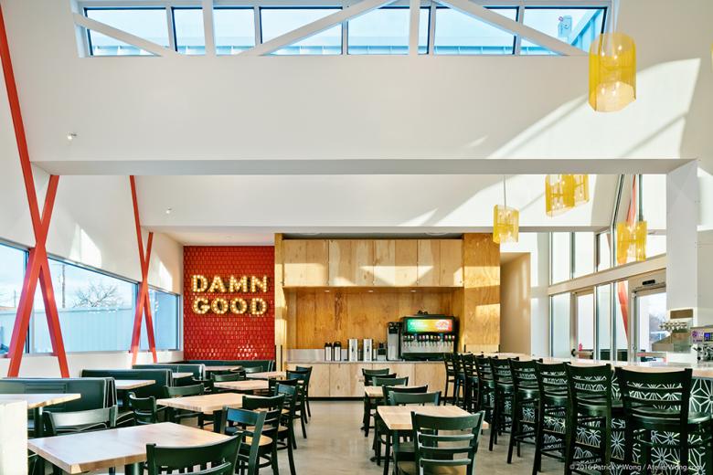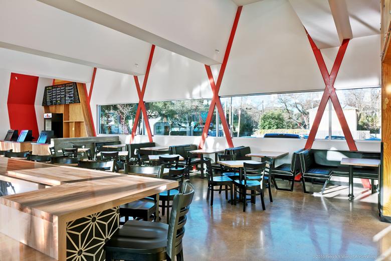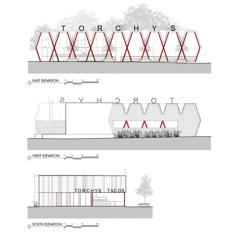 After several years of testing and establishing a design language embodying the Torchy's Tacos brand, mainly through the design and construction of interior finishouts and second generation remodels, Chioco Design was commissioned to create their new flagship location. The ground-up building, located along Austin's iconic South Congress Ave., is situated on the site formerly occupied by Fran's Hamburgers, an Austin based restaurant established in the 1970s that symbolized a nostalgia for the archetypal Texas drive-in diner. Chioco Design set out to create a building able to respect it's iconic setting, allude to it's historic roots and fulfill the needs of a modern restaurant. Consciously referencing the archetypal 50s-era drive-in diners, Chioco Design developed an iconographic structural 'X' & 'Y' form traversing the length of the block facing South Congress Ave. These bright red columns support a crenellated roof profile extruded through the entire building, seamlessly connecting inside to out, and allowing for the addition of numerous north-facing skylights which provide an abundance of consistent natural light. Steel planters and tree wells extend out to the sidewalk and street to act as an inviting and accessible area adjacent to the vibrant energy of South Congress Ave.