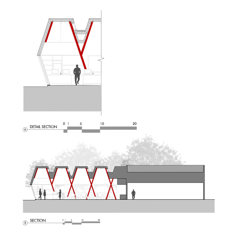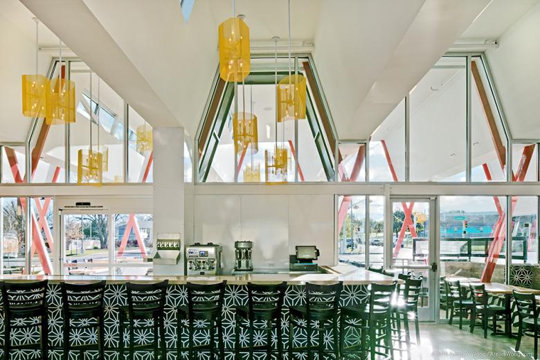 There is a basic structural bay that spans over the interior and exterior dining spaces that incorporates a north facing skylight.  This structural bay is repeated along the length of the building, which creates a bold structural pattern along the edge of the adjacent main street.  The structural pattern is also referential to 50s and 60s era restaurant design.