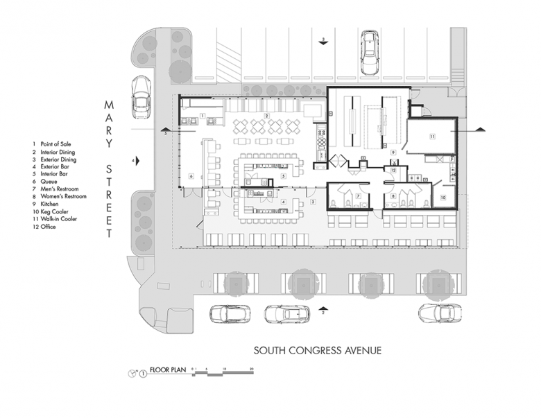 The roof has been crenelated to allow for numerous north facing skylights which creates an indoor and outdoor dining space filled with even natural natural light.  The dining patio has also been oriented along the length of the building facing South Congress Ave. which has numerous existing street side dining spaces.
