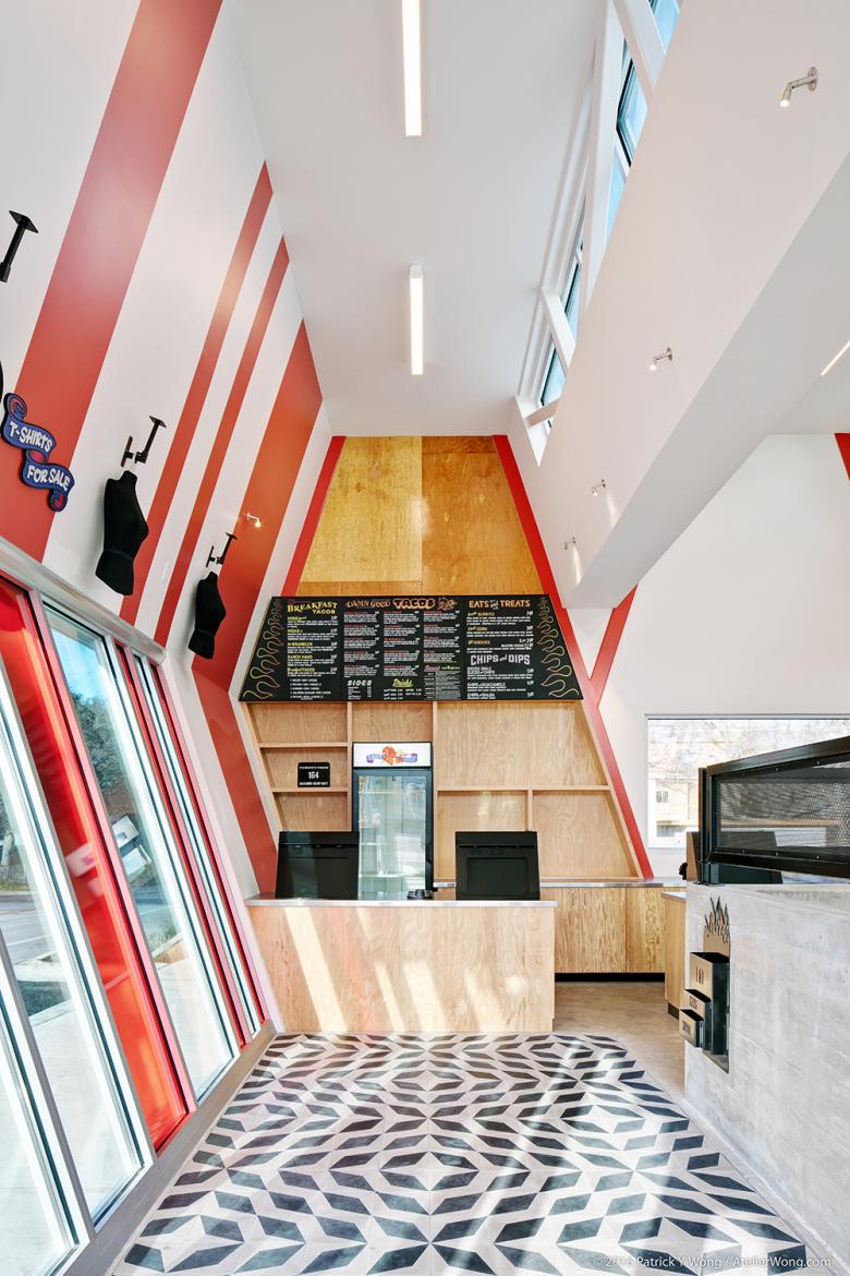 Drawing from a carefully developed and dynamic material palette from previous Torchy's locations Chioco Design implemented the now-symbolic red road reflectors across the western facade emphasizing the eclectic character of the neighborhood. Encaustic cement tiles are thoughtfully used around the interior andexterior, even materializing as a flooring surface to distinguish the entrance and queuing area. Brightly colored custom fabricated light fixtures hover above both bar areas serving as a significant contrast to the white ceilings during the day and brilliantly illuminating the space at night. Half-height board-formed concrete walls, a staple of the Torchy's brand, serve to direct traffic and act as a compliment to the warm wood tones found around the space.