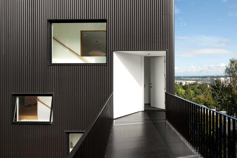 The Tower House is located in the west hills of Portland, Oregon, overlooking the city and the Willamette River. It is sited on a steep and narrow lot with road access from above. The house is 4 stories tall with a footprint of 600 square feet. One enters on the third level via a 25-foot-long steel bridge. The house is clad in black vertical corrugated metal with rounded corners to achieve an uninterrupted fabric like sleeve. The simple volume is punctuated by three recessed loggias.