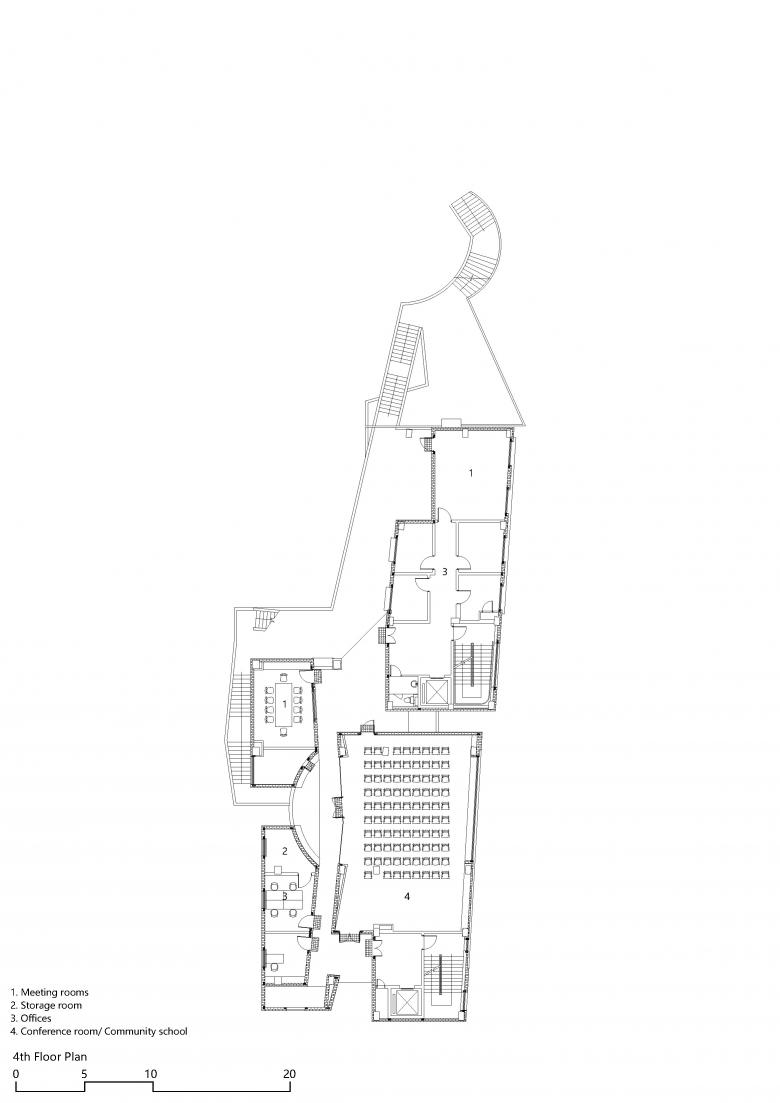The pre-existing building complex on the site of the Nantou Neighbourhood Centre comprised of two communal facilities for residents on the ground floor with apartments above. With the transformation by Atelier Feichang Jianzhu, the residential function was removed and public functions including a small hospital, community offices, exhibition spaces, teaching and meeting rooms for the neighbourhood were integrated instead. This heterogeneous and complex mix of uses required new access points and larger voids for natural lighting. Four buildings volumes were defined, in keeping with the scale of the neighbourhood, accessed via external corridors and staircases.
