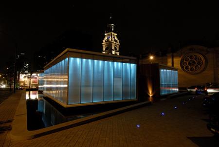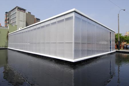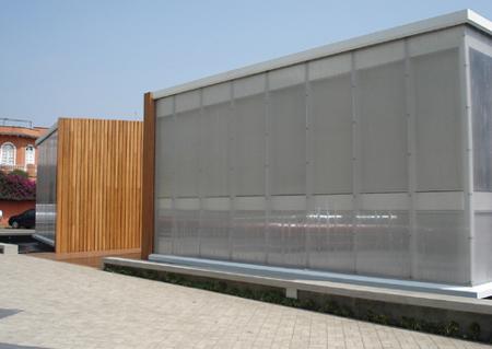 Air pollution in Lima causes the façades to be impregnated by a large quantity of particles. An ingenious cleaning system has been devised whereby water streams down from the cornice at regular intervals to wash the polycarbonate. This artificial rain on the façade protects the building and improves the quality of the air.