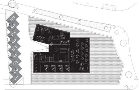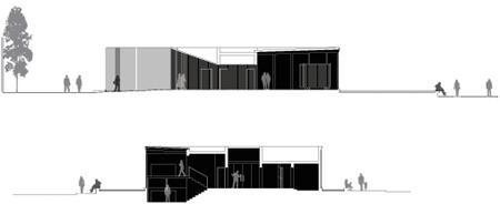 It was therefore decided that the program be concentrated into a compact volume set back behind a "liquid plaza" which would reflect the surroundings and act as a buffer for the building. Instead of walls that segregate, benches that congregate: a long bench for passers-by was installed around the perimeter of the lot, with a pedestrian passageway leading to the entry and the parking area.