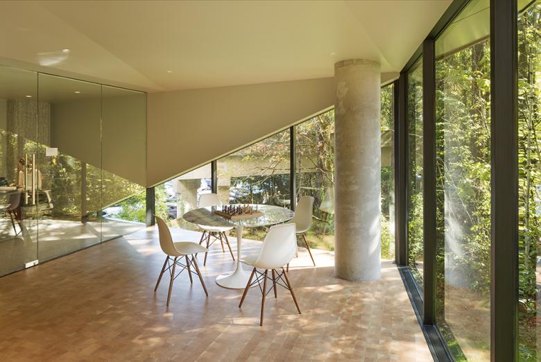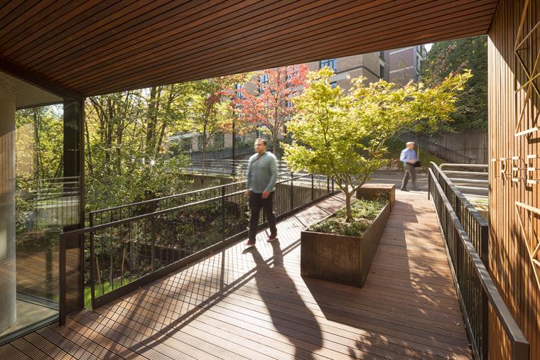 A precedent photo from LEVER Architecture shows a tree in the process of being felled, an angular chunk removed from its trunk. This image resonates with the section of the TreeHouse, which contends with a sharp drop from one side of the site to the other by a bridge and a glazed wrapping that follows the slope. LEVER's Thomas Robinson answered a few questions about the mixed-use building in Portland, Oregon.